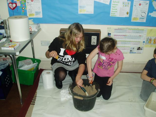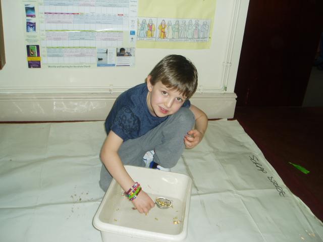 And so we dug in a bucket of sand to find treasure - a chocolate coin!